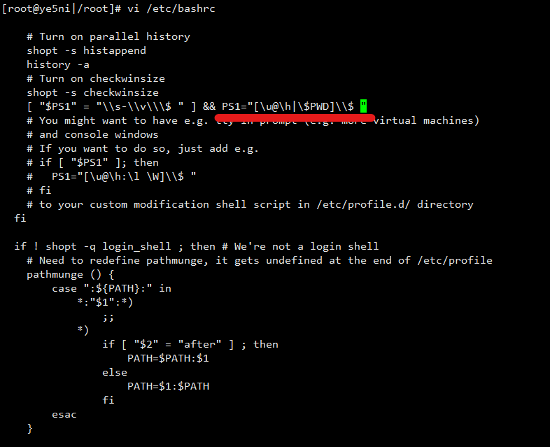 ๊ทธ ๋ถ๋ถ์ PS1="[\u@\h|\$PWD]\\$"๋ก ๋ฐ๊ฟ์ฃผ๋ฉด ๋๋ค.