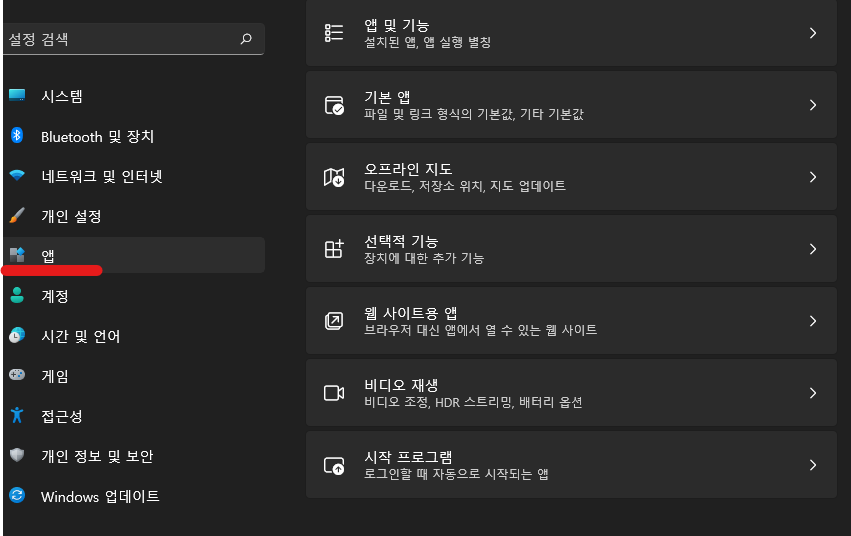 1. [윈도우] - [설정] - [앱] 으로 들어가기