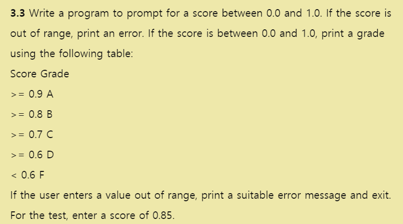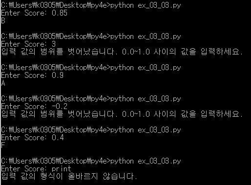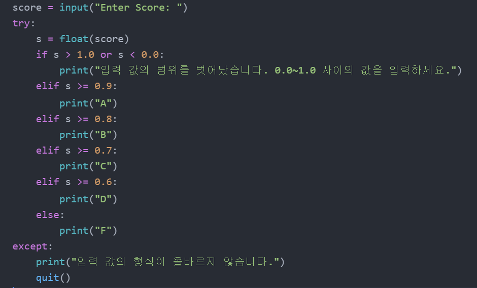 * 0.0 ~ 1.0 범위 밖의 값을 입력했을 때 발생할 수 있는 예외는 if문으로 처리해주었다. 배운 개념의 범위 안에서만 코드를 짜려다보니까 계속 비슷한 에러가 났다. 예외처리가 꼭 try except문으로만 처리할 수 있는 것은 아니라는 것을 깨달았다!