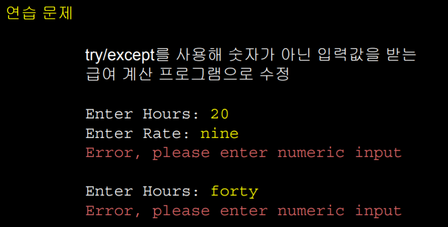 예외처리는 예를들어, 사용자가 입력값으로 숫자만 넣어야 하는 경우에 문자를 넣었을 때 프로그램이 종료되고 멈추는 것 대신에 올바른 값을 넣도록 유도할 때 필요!