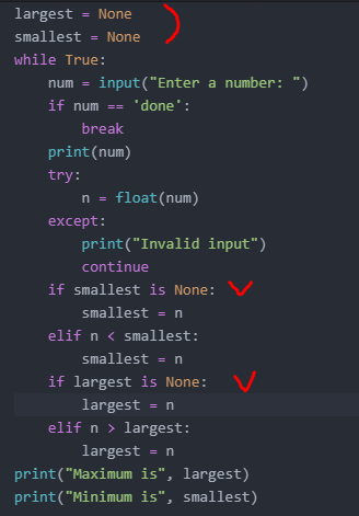 하지만 최대, 최소 값을 구할 때 변수 largest와 smallest를 None으로 초기화해두었기 때문에 파이썬의 'is' 연산자를 활용해 정의해주지 않으면 에러가 난다는 것을 알게 되었다. 또 'done'은 문자열이기 때문에 input 함수를 이용해 받은 값을 float형으로 변환할 필요가 없지만 이후에 받게되는 숫자들은 str 에러가 나기 때문에 try문에 형변환 정의 후 그 밑에서부터 구현해야 한다는 것을 깨달았다.