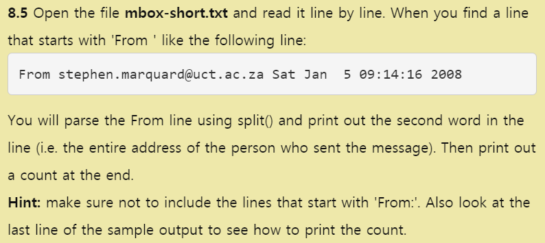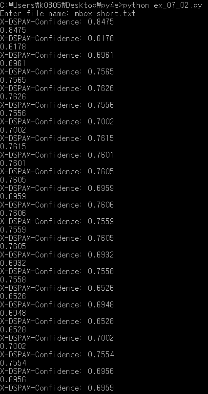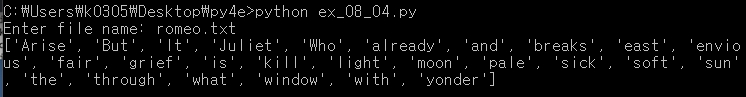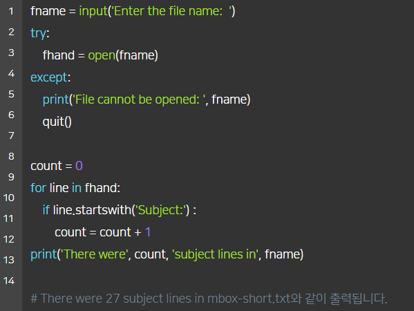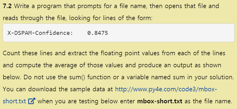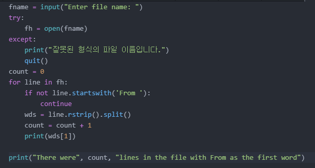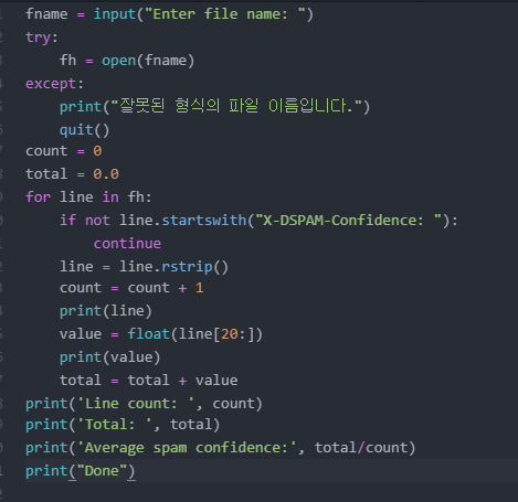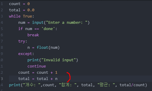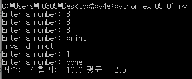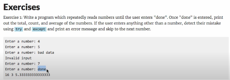 * 이 예제에서는 위와 똑같이 try except를 사용해 숫자가 아닌 다른 값을 입력 받았을 경우에 예외처리가 되게끔 해주었고, if문을 사용하여 필터링을 통해 사용자가 'done'을 입력하게 되면 루프문을 종료하도록 구현하였다.