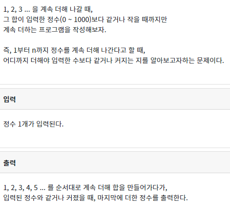 알게된 사실 4) 마지막에 더한 정수를 출력하는 것이기 때문에 if문에 걸려서 마지막으로 돌아가고 중단되어 버린 i값을 출력해주면 된다.
